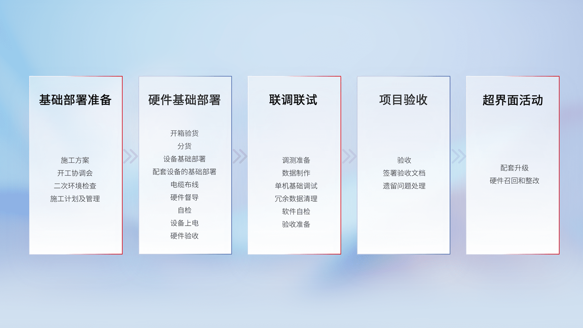 从基础部署准备、、、硬件基础部署、、、、联调联试、、、项目验收、、越界面活动的全过程可追溯,,,,保证施工质量和进度。。。
